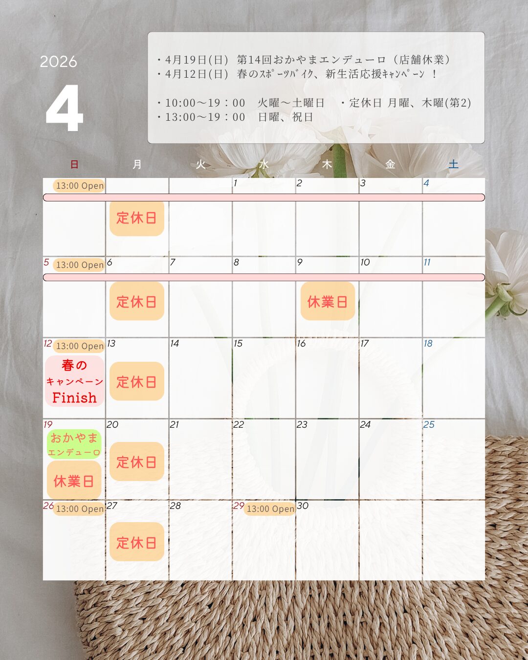 お休み案内 4月6日(月),9日(木),13日(月),20日(月),27日(月),29日(水祝)13:00~