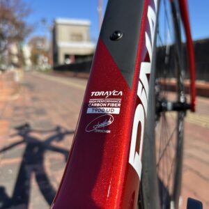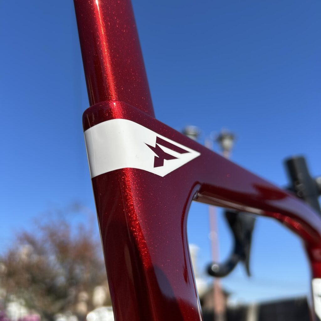 塗装をしっかりと強調するようにブランドロゴは白色、ダウンチューブには控えめに黒色。