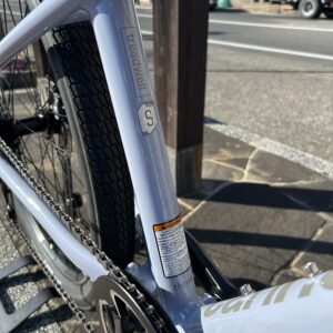 側面にはメーカーロゴが無く、ダウンチューブの上面に灰色でメーカーロゴが入っています