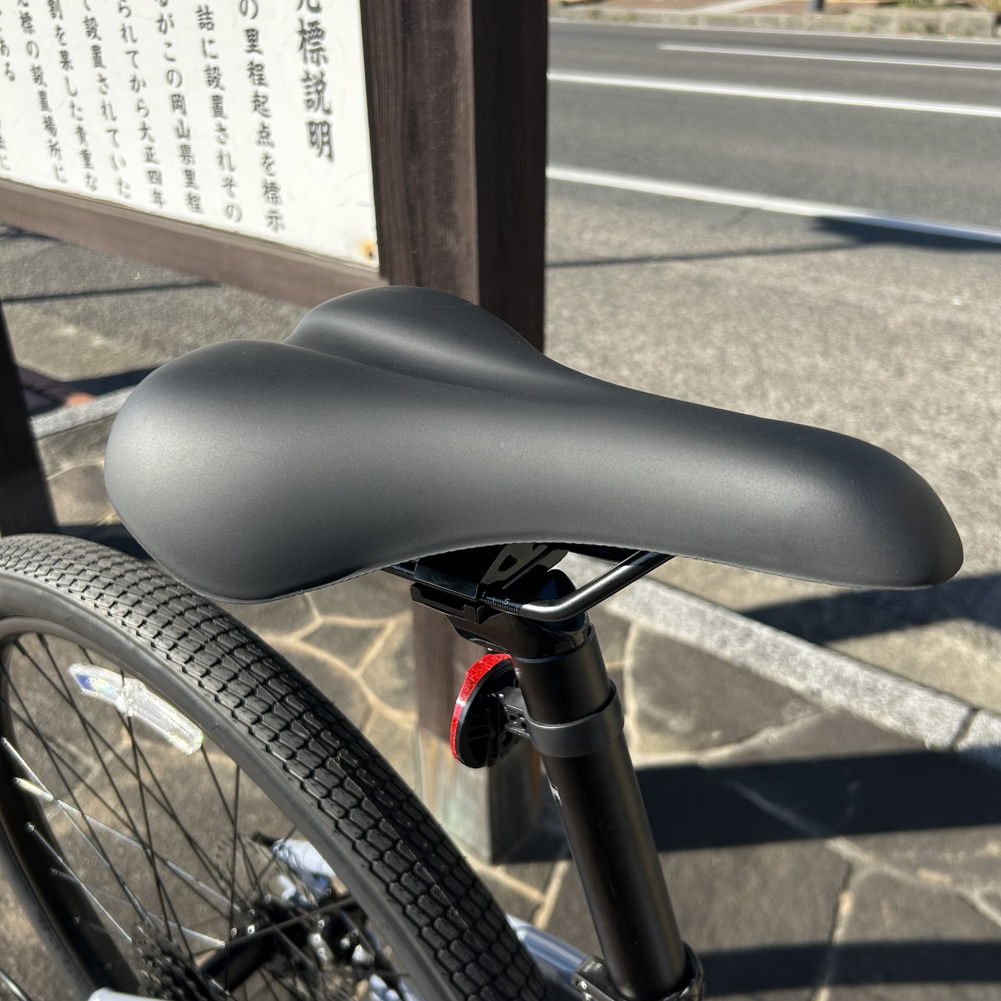 タイヤは650×47b、サドルは少し厚めのものが採用されているので路面からの衝撃もしっかり吸収してくれます